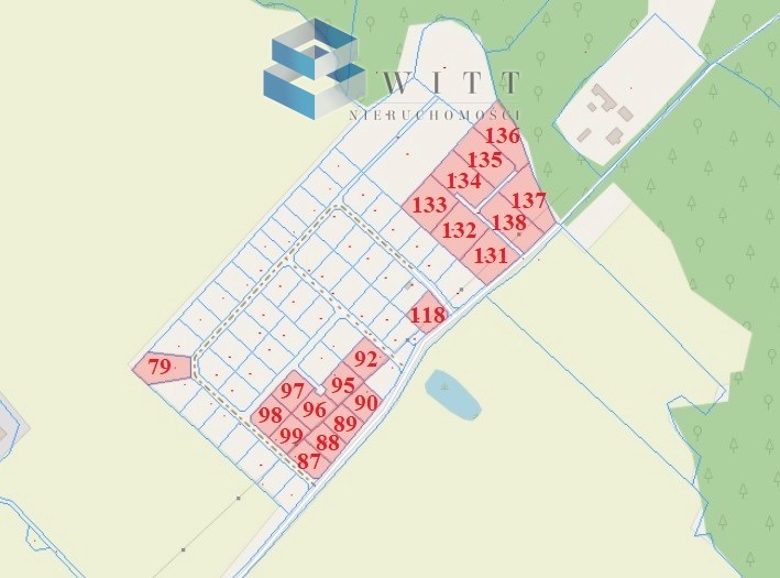 Działki 135/87, 1135/88, 135/89, 135/90, 135/95, 135/96, 135/97, 135/98, 135/99 o pow. od 1451m2 do 1711m2 w cenie 35 zł/m2 każda.